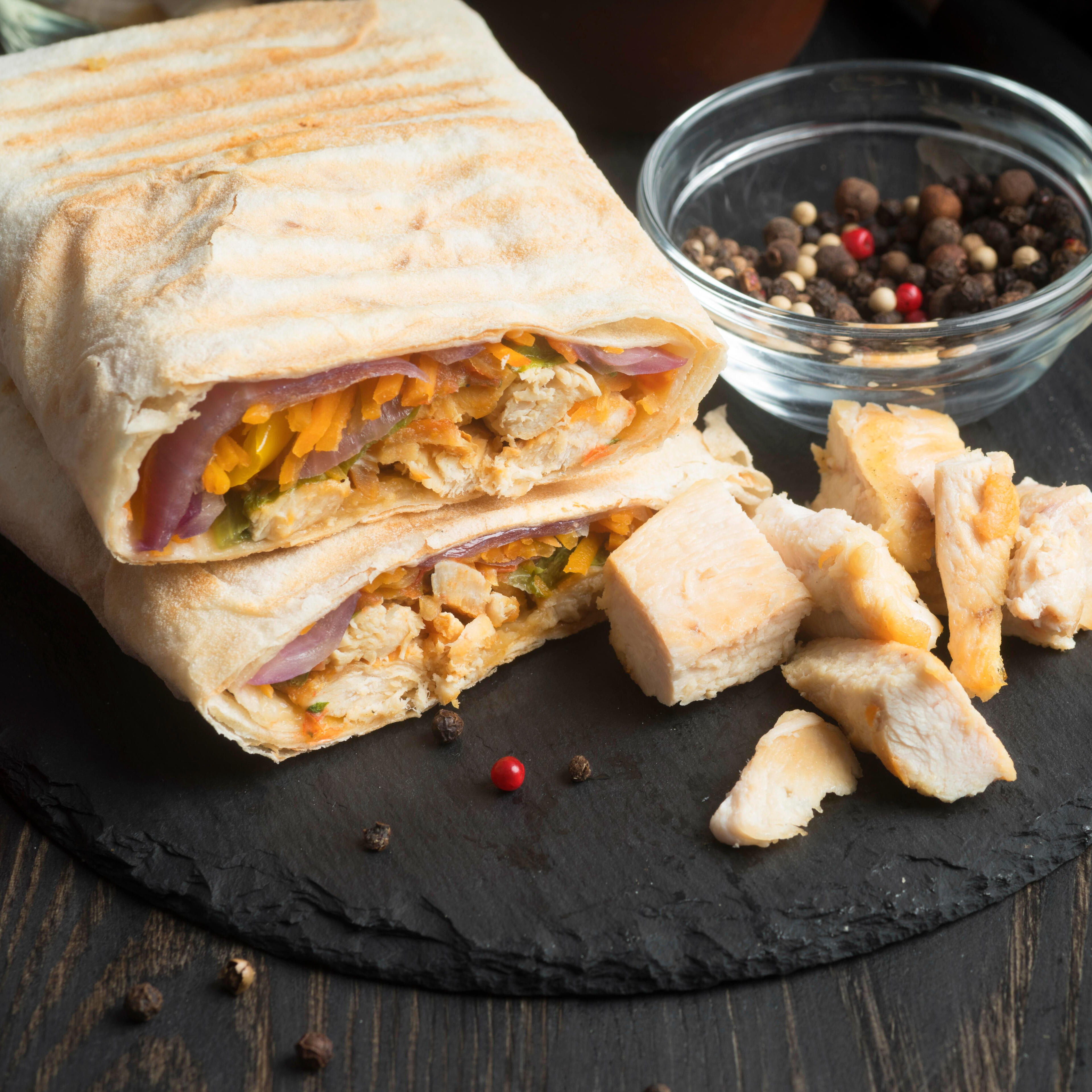 Honey Wheat flatbread folded with grilled chicken, scallions, and a drizzle of sesame sauce.1000 gil